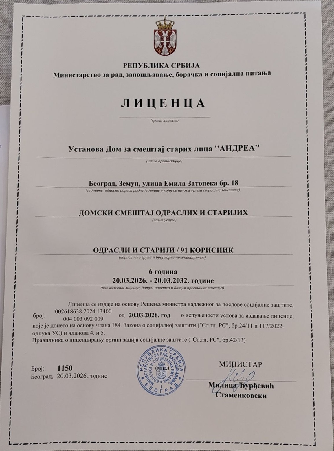 Dom za stare „Andrea“ poseduje važeću licencu broj 1150, izdatu od strane nadležnog ministarstva, sa rokom važenja do 20.03.2032. godine. Licenca potvrđuje ispunjenost svih propisanih uslova za pružanje usluge domskog smeštaja, sa kapacitetom do 91 korisnika.